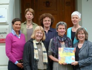 Die Mitarbeiterinnen von donna klara mit der Gutachterin (unten von rechts: Gabriele Kampmann (ArtSet), Susanne Voll, Lisa Schneider, Gerburg Lutter, oben: Angela Lipp, Regina Emelius, Edith Paulsen)