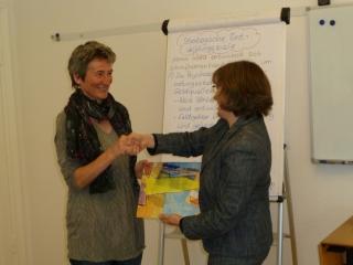 Gabriele Kampmann von ArtSet überreicht die „Kachel“ als Zeichen des erfolgreichen Testierungsverfahrens an Susanne Voll.